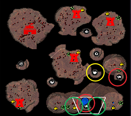 레벨이 올라가면서 능력치도 해금되는 만큼 레벨 때문이라도 이 힘든 시기를 견뎌내야 황금기가 올 것 같았다. 일단, 아래 미니맵에서 빨간색 원으로 칠해져 있는 것이 캠프이다. 해당 캠프의 몬스터들을 잡으면 루미나이트 자원을 받는데 그걸로 본진 바로 옆에 있는 멀티를 먹는 시기를 앞당길 수 있다.