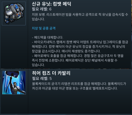 더 사기인 것은 '컴뱃 메딕'이다. 배력에서 생산 가능한 메드텍은 메딕으로 스타와는 다르게 기계도 치료가 가능하다. 물론 기능 업그레이드를 해야한다. 컴팻 메딕이 되는 순간부터는 치료 시 방어력을 올려주기 때문에 유닛 유지력을 끌어올려준다. 결록 메드텍 + 호넷 조합이기 때문에 조합 자체는 단조롭게 플레이 가능하다.