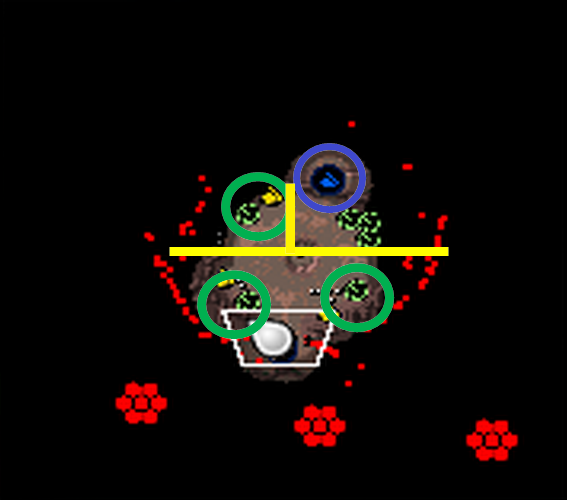 초반 컨트를 실수가 있을 경우에는 클리어를 못하는 경우가 생겨서, 안전하게 가고 싶다면 방어 먼저 진행한 후에 멀티를 먹어도 된다. 뭘 해도 상관 없다. 참고로 노란색은 항후 진행할 센트리 포스트(벙커)를 지어놓을 라인이니 참고하시면 된다.