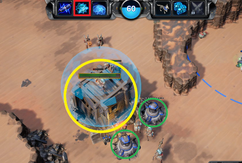 블록케이드의 힐인 리바이탈라이즈는 아군유닛에게도 적용이 되며, 뱅가드의 리페어 기능은 아군의 타워도 치료가 가능하다. 아래 초록색으로 표시된 타워가 있는데, 생각보다 굉장히 강하기 때문에 끝까지 지켜주는 플레이로 임했다. 돈이 많아서 극초반만 잘 버티면 유리하게 게임을 플레이 할 수 있다.