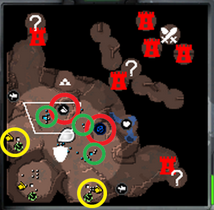 아래 그림의 빨간 원에 있는 캠프를 잡아주면 2멀티를 돌릴 수 있는 돈이 마련이 된다. 사실 캠프가 6시와 9시에도 있지만 그것까지 잡을 시간은 안되는데 시간되면 잡아주면 된다. 터프워에서 블록케이드의 플레이 컨셉, 아니 뱅가드의 컨셉인 것 같다. 센트리 포스트를 활용해서 아군의 타워를 같이 지켜주는 것이다.