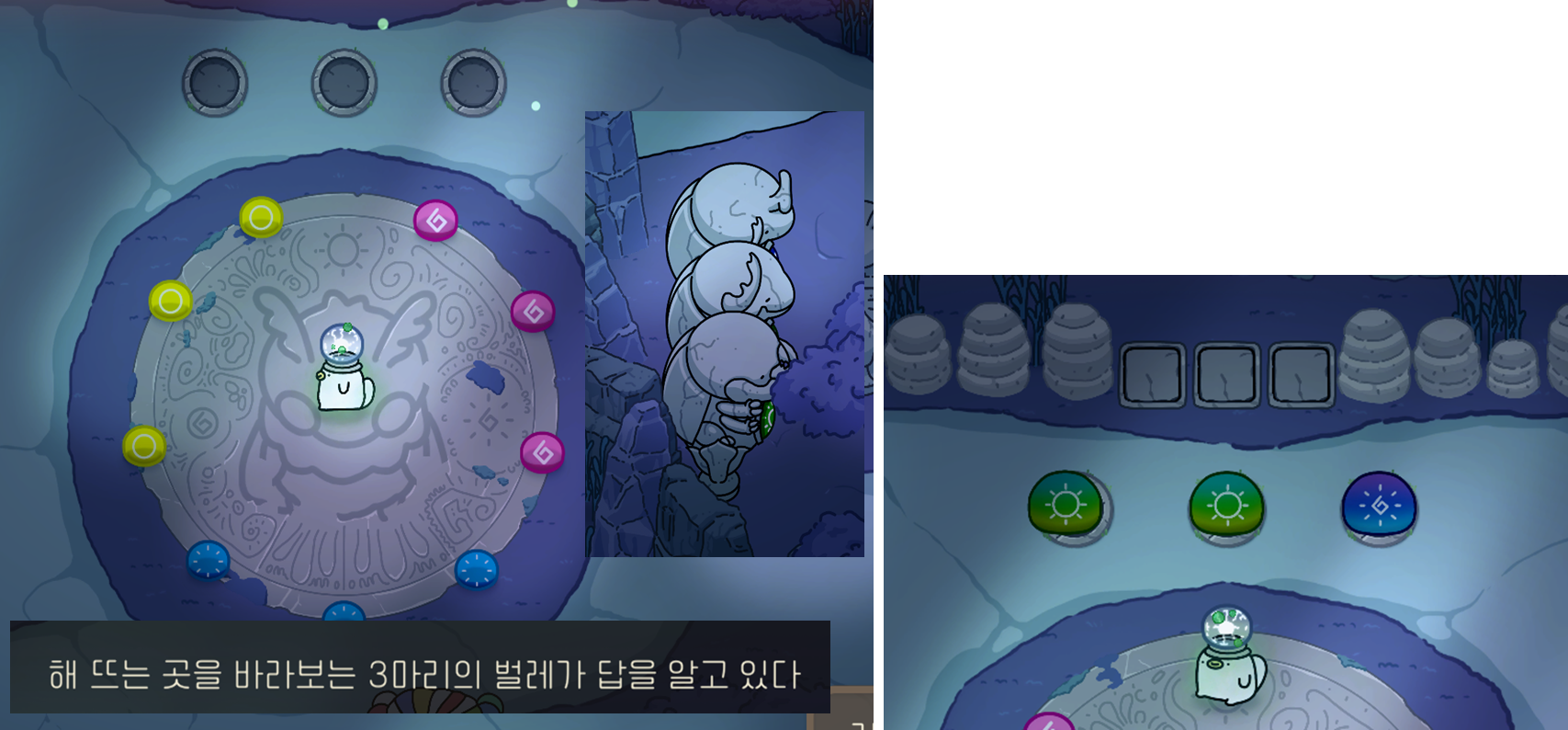 바로 다음 맵에 3개짜리로 되어있는 맵이 존재하는데 양 끝에 있는 돌을 사용해서 올려놓으면 된다. 색깔에 대한 이해 그리고 색을 합치고 분리하는 튜토리얼은 태양의 마을에서 이미 많이 해본 상태라 크게 어렵지는 않아보인다. 그냥 넘어갈까 하다가 시간이 남아서 써 보았다.