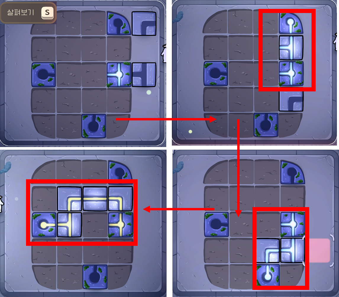 게임을 하지 않고 아래 그림을 보면 무엇을 뜻하는지 잘 모를 수 있으나 겪어보신 분이라면 어떤 움직임을 표현했구나 알 수 있다. 영상이 아닌 글로 작성하려다보니 제한사항이 많다. 아래 그림이 꼭 정답은 아니고 해보니까 풀어가는 방법이 참 많은 것을 알 수 있다.