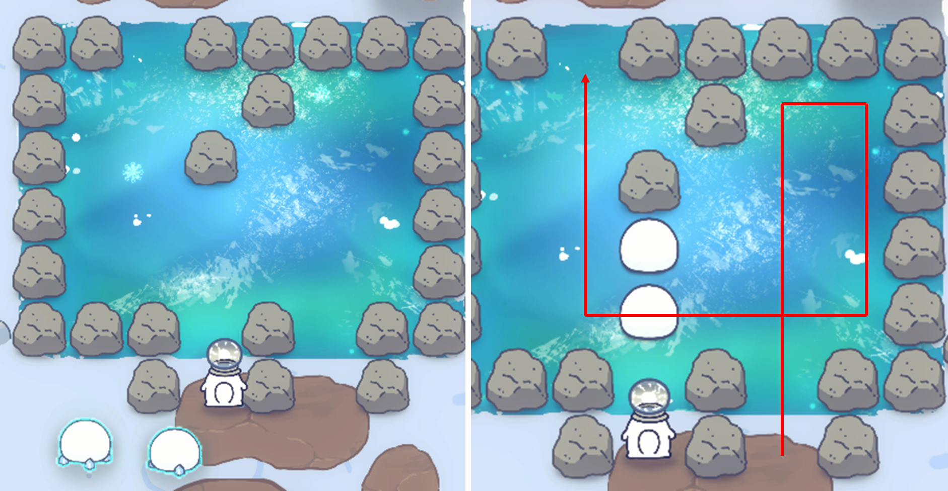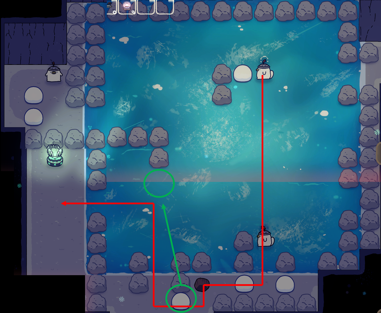 빙판에 방법을 알려주는 첫 퀴즈, 예전 포켓몬스터 게임에 등장한 맵인데 참 재미있는 맵이다. 그냥 단순히 빙판이 이렇게 미끄러진다는 것을 알려주는 맵으로 향후 진행될 다양한 설원의 퀘스트의 시작점이 되는 맵이다. 설명이 다소 부족하긴 해도 이렇게 차근차근 클리어하면서 퍼즐을 푸는 재미가 있다.