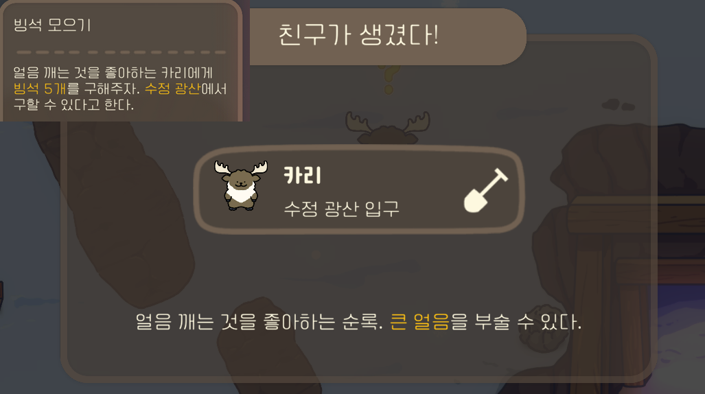 빙석 5개는 수정광산에서 얻을 수 있으며 빛나는 돌덩이를 젤리 폭탄이나 박치기로 부술 수 있다. 카리는 설원 퀘스트를 진행하는데 매우 중요한 역을 한다. 왜냐하면 이 친구로 인해서 큰 얼음을 부수고 들어가 맵을 밝히기 때문이다. 귀찮더라도 꼭 클리어하고 가자. 해당 퀘스트는 수정광산 입구에서 받을 수 있다.