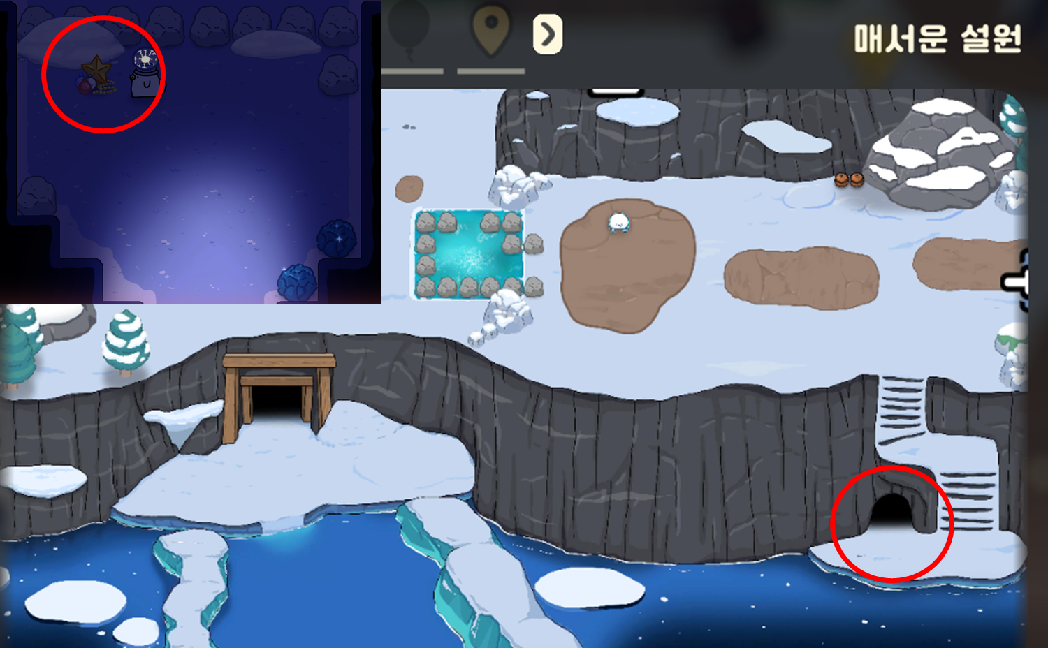 광산통로 퀘스트 중 두개의 통로를 열어주는 퀘스트가 존재한다. 엄청 큰 눈덩이가 있는데 박치기를 통해서 부술 수 있다. 박치기는 처음 설원에 왔을 때 배울 수 있는 'e' 스킬로 부술 수 있다. 박치기를 꾹 누르고 있으면 몸이 빨간색으로 변하는데 그때만 부술 수 있다. 생각보다 쉽게 깨진다.