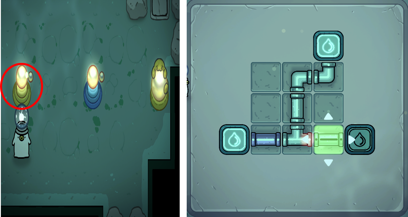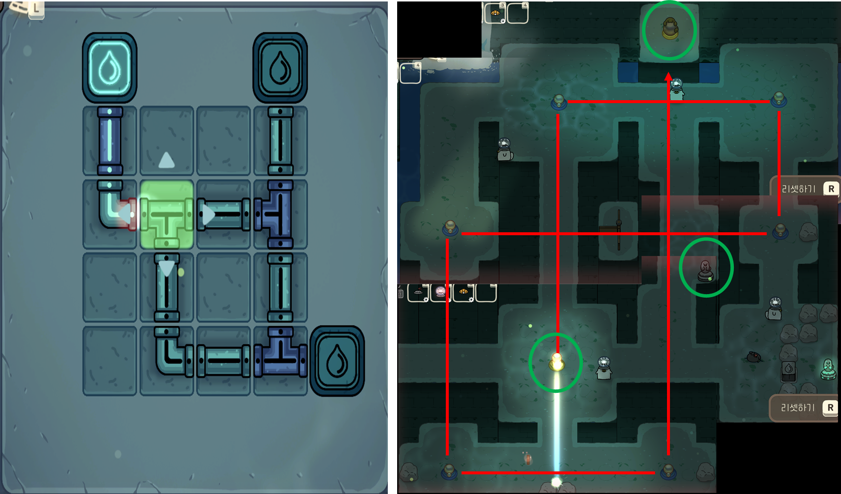 두 번째 퀴즈는 수로관을 연결하는건데 이전 맵들과는 다르게 회전이 가능하다. 들기(D) 이후에 반시계방향 (Q) 혹은 시계방향 (E)로 맞추면 된다. 아래 그림처럼 맞춰주면 통로가 오픈이 된다.