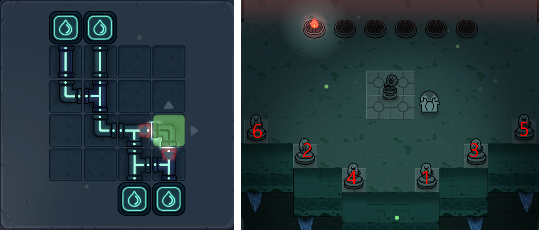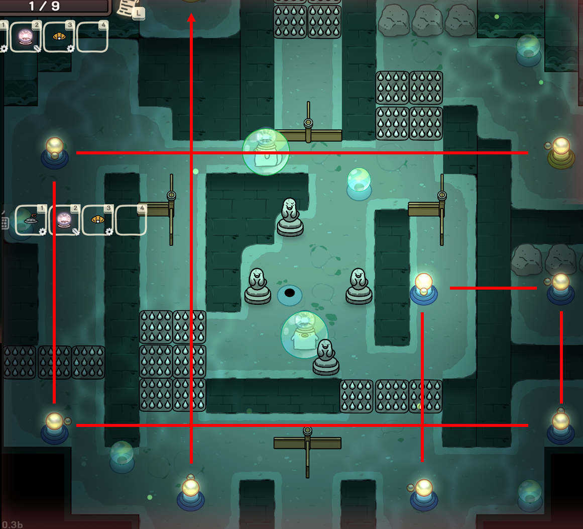 나머지 퀘스트 수로연결이나 처음 보는 물빵을 떨어트리기와 같은 퀴즈가 존재한다. 수로 연결이야 뭐 우리가 워낙 자주 해봤으니 어렵지는 않을 것 같고 물방을 떨어트리는 것은 처음 보는 패턴이다. 아래 그림처럼 동상을 순서대로 때리면 불이 들어오고 모든 불이 들어오면 문이 열린다.