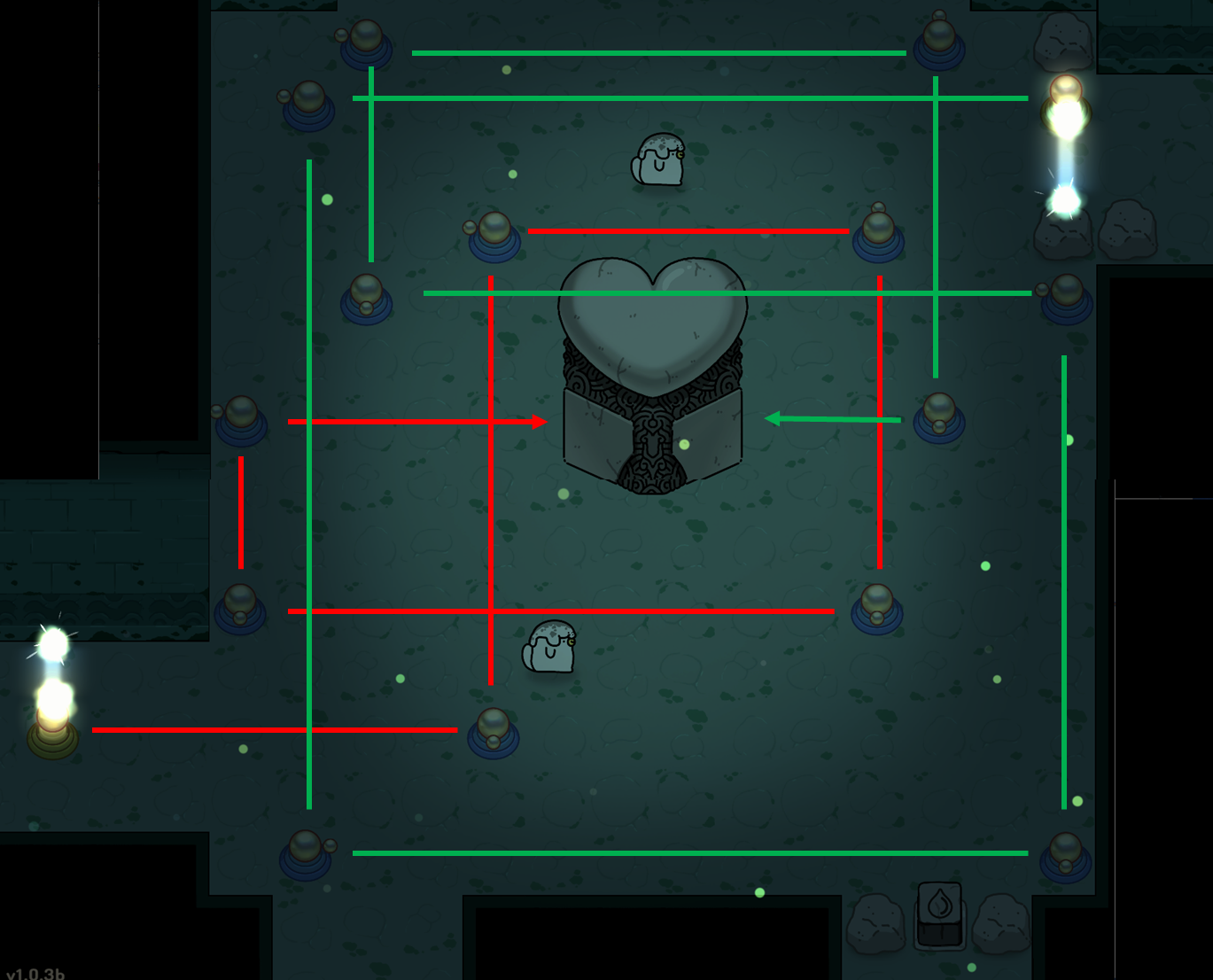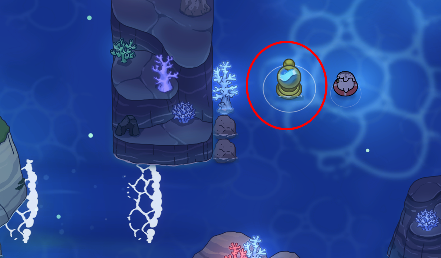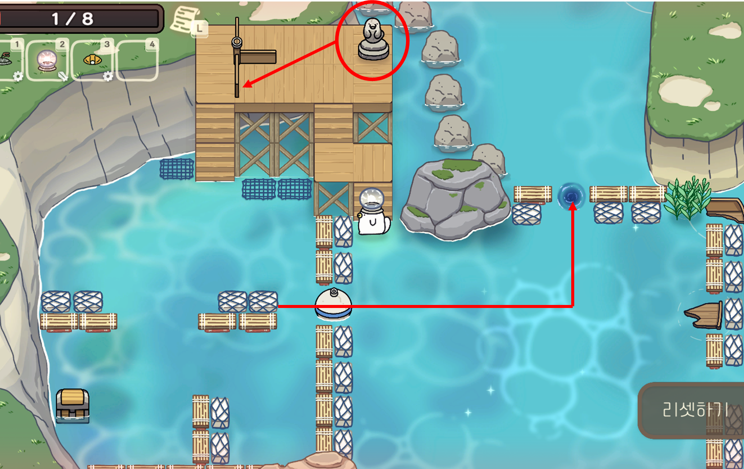 해당 기믹을 사용하는 퀴즈가 하나 더 존재하니 방법만 알면 어렵지 않다. 부표라고 해야하나? 맵 중간에 있는 저것을 소용돌이에 넣으면 소용돌이가 잠잠해져 길을 건널 수 있는 방식이다. 위에 석상은 때리면 바리게이트가 움직이며 길을 만들어 낸다. 지금까지 봤던 리셋하기 맵 중에서 제일 쉬운 듯 하다.