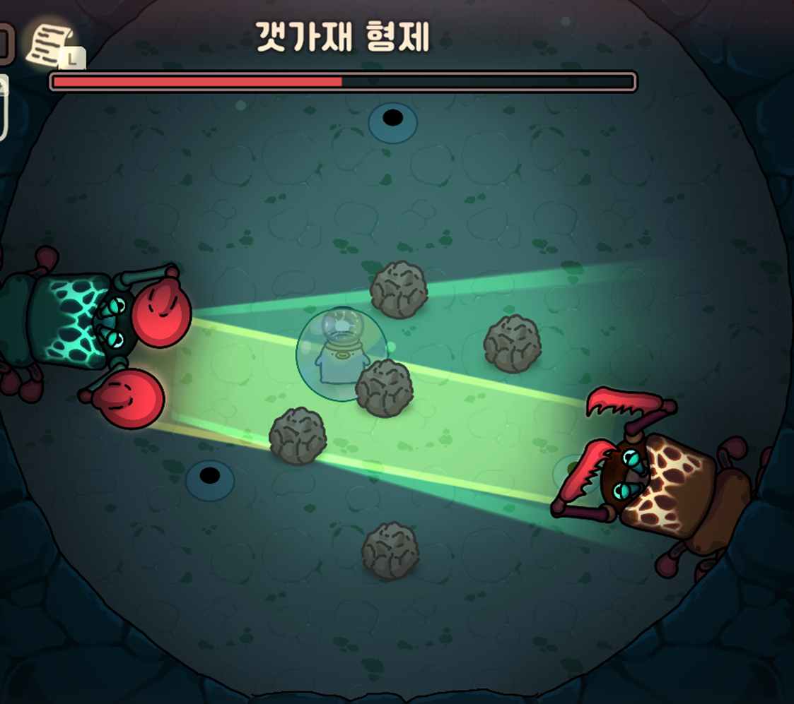 갯가재 형재를 부술 수 있는 것은 뭐가 있다는 안내문구가 있었는데 놓치고 보스를 맞이했다. 보스는 갯가재 형제인데 우리가 가지고 있는 어떤 무기로도 데미지를 줄 수 없다. 갯가재 형제는 서로를 공격하게 만들어야하는데 그때 나는 무조건 맞아야하는 운명이다. 하지만 방울을 통해서 데미지를 막아주는 방식으로 깨면 된다.