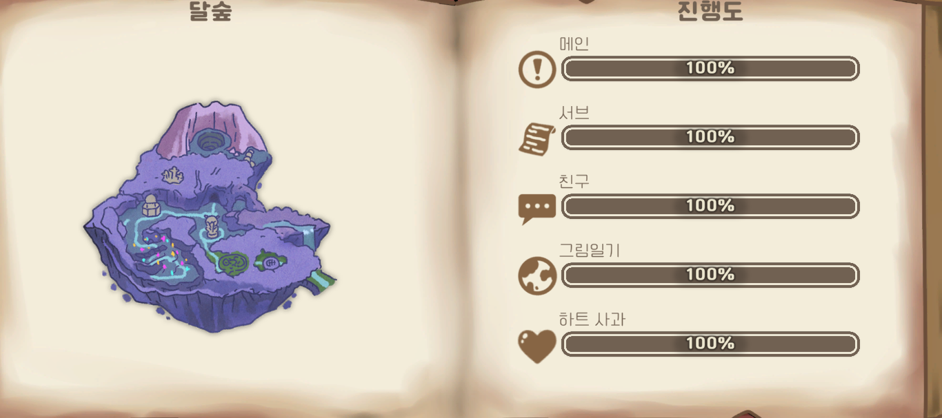 * 현재 진행도: 메인 100% / 서브 100% / 친구 100% / 그림일기 100% / 하트 사과 100%