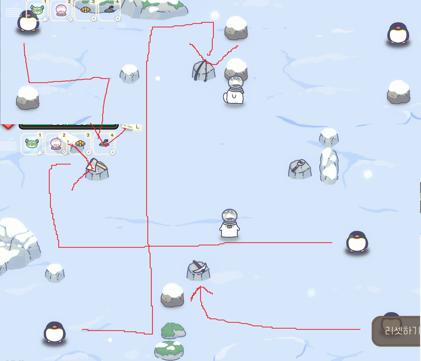 - [퀴즈] 눈송이 마을 힌트에 따르면 나뭇꾼 2, 낚시꾼1, 광부1로 팽귄을 이동시키면 좌측 하단의 모자 획득 가능