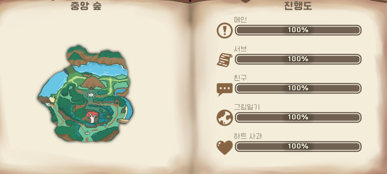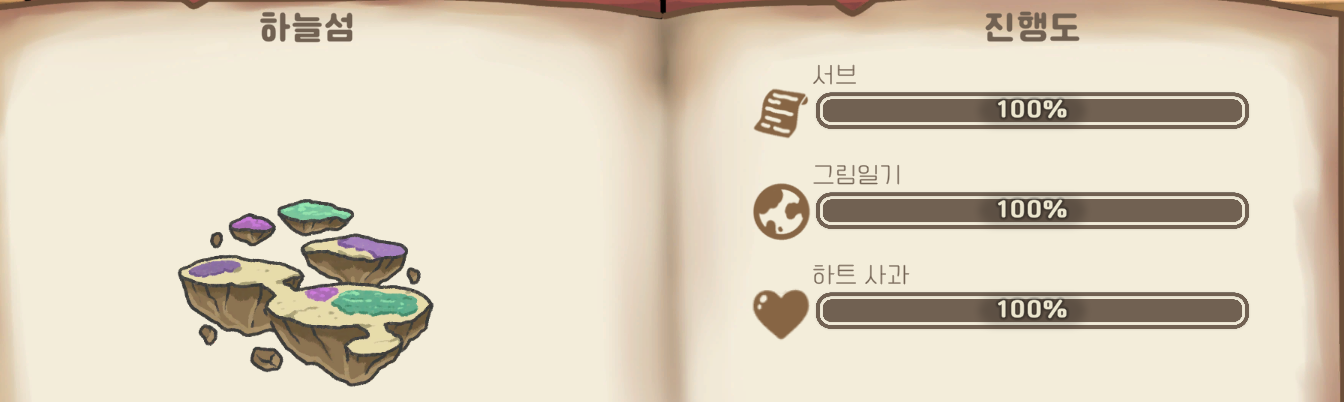 * 현재 진행도: 메인 100% / 서브 100% / 친구 100% / 그림일기 100% / 하트 사과 100%