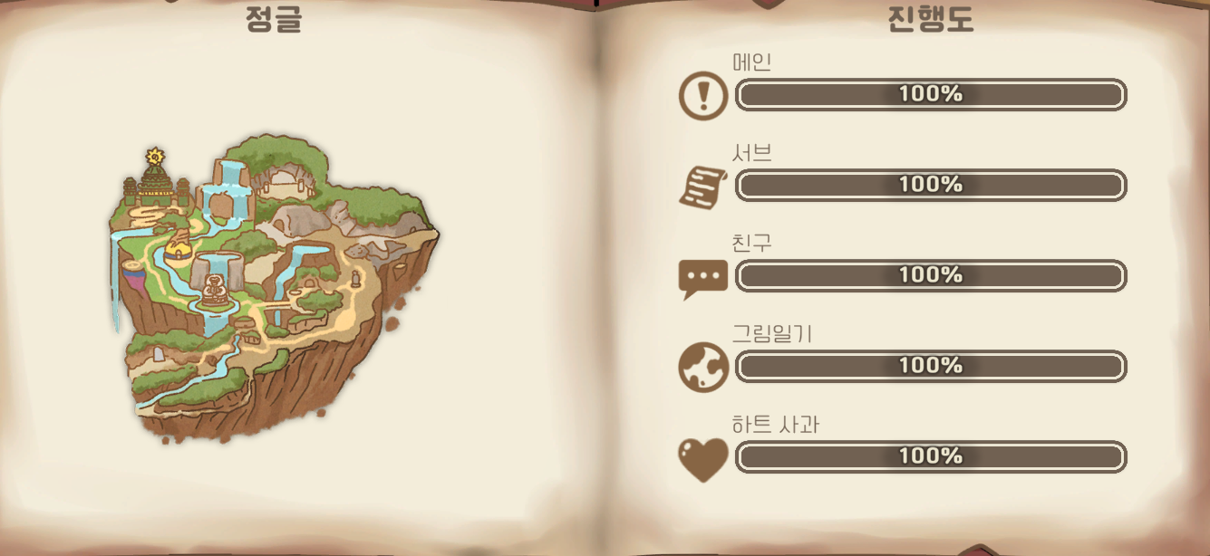 * 현재 진행도: 메인 100% / 서브 100% / 친구 100% / 그림일기 100% / 하트 사과 100%