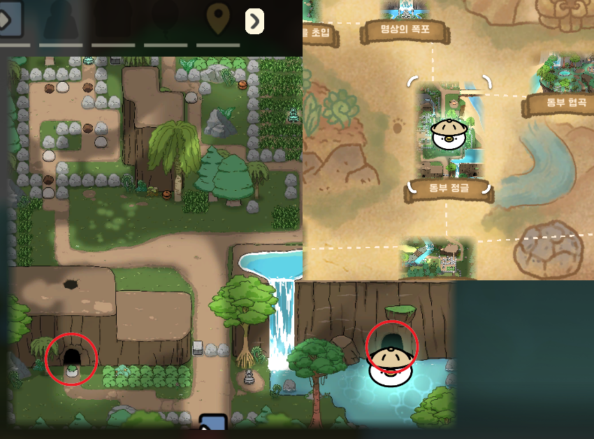 정글은 총 3개의 돌 수집처가 존재한다. 동부 정글의 춤의 사원, 동부 정글의 음악의 동굴, 동부 협곡의 협공통로가 있다. 더 있을 수 있지만 제가 돌았던 곳들은 이렇게 3개였다. 그 중에서 아래 그림처럼 동부 정글을 통해서 음악의 동굴과 춤의 사원 모두 들어갈 수 있기 때문에 이 맵을 주로 이용을 했다.