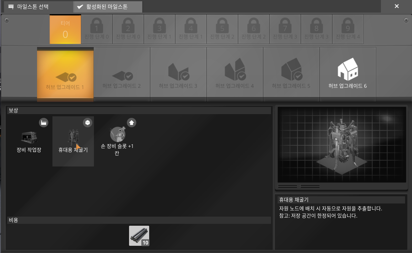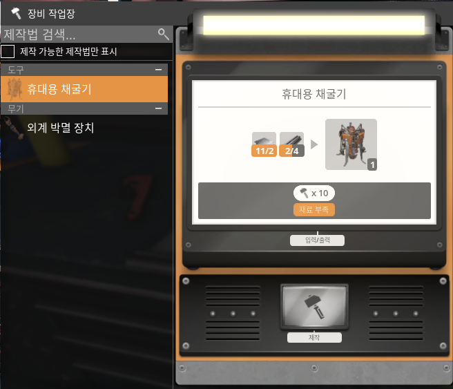 허브 업그레이드1을 완료하면 장비 작업장을 만들 수 있다. 당연하겠지만 장비 작업장에서 휴대용 채굴기를 만들 수 있다. 휴대용 채굴기는 철판 2개와 철봉 4개로 만들 수 있으며, 나같은 경우에는 그냥 한 번에 많이 만들어서 다양한 자원에서 활용하려고 한다. 9개 정도 만들어서 지금 필드에 있는 철광석과 구리광석 그리고 석회석까지 얻어보려고 한다.
