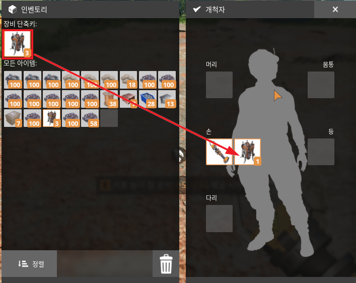 휴대용 채굴기를 만들었다면, Tab 키를 눌러 잘 만들었는지 확인을 할 수 있다. 장비를 드래그해서 손에다 넣어두면 이제 아이들 뚝배기를 깰 수 있는 외계 박멸 장치와 함께 하나 더 들 수 있게 된다. 마우스 휠로 손 무기를 자유자재로 바꿀 수 있으다.