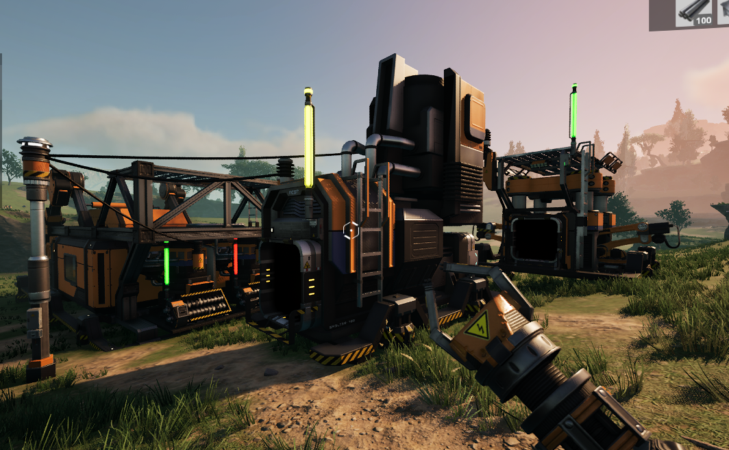 하나의 바이오매스 연소기에서 전신주를 통해서 제작기와 제련기를 이어준 상대이다. 전신주는 총 4개의 전선을 연결할 수 있으며 그 중 하나가 연소기여야하기 때문에 총 3개의 공장을 설치할 수 있다. 제련기와 제작기는 총 4MW가 소요되며 전신주 또한 적은 전력은 소모하는 것 같다. (송전선은 단축키 2번으로 지을 수 있으며, 거리가 끊길때는 자동으로 전신주를 만들어준다)