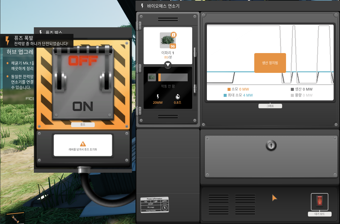 테스트삼아 해보셔도 좋은게, 퓨즈 수리에 대한 도전과제도 있기 때문에 퓨즈를 일부러 폭발 시켰다가 퓨즈박스를 다시 OFF에서 ON으로 변경시켜주자. 그러면 도전과제 새로운 공포 '폭발판 퓨즈를 수리하십시오'라는 과제를 얻을 수 있다. 여튼 초반 바이오매스 연소기는 아주 소중하다.