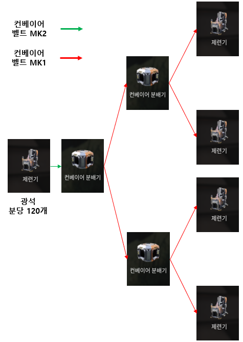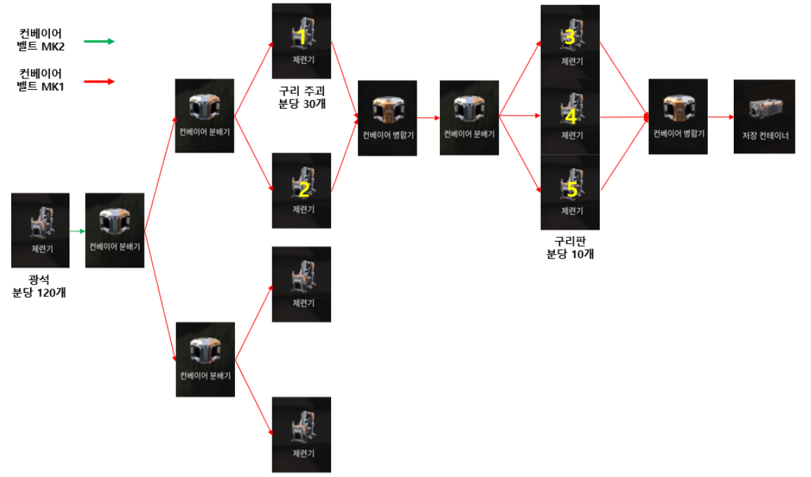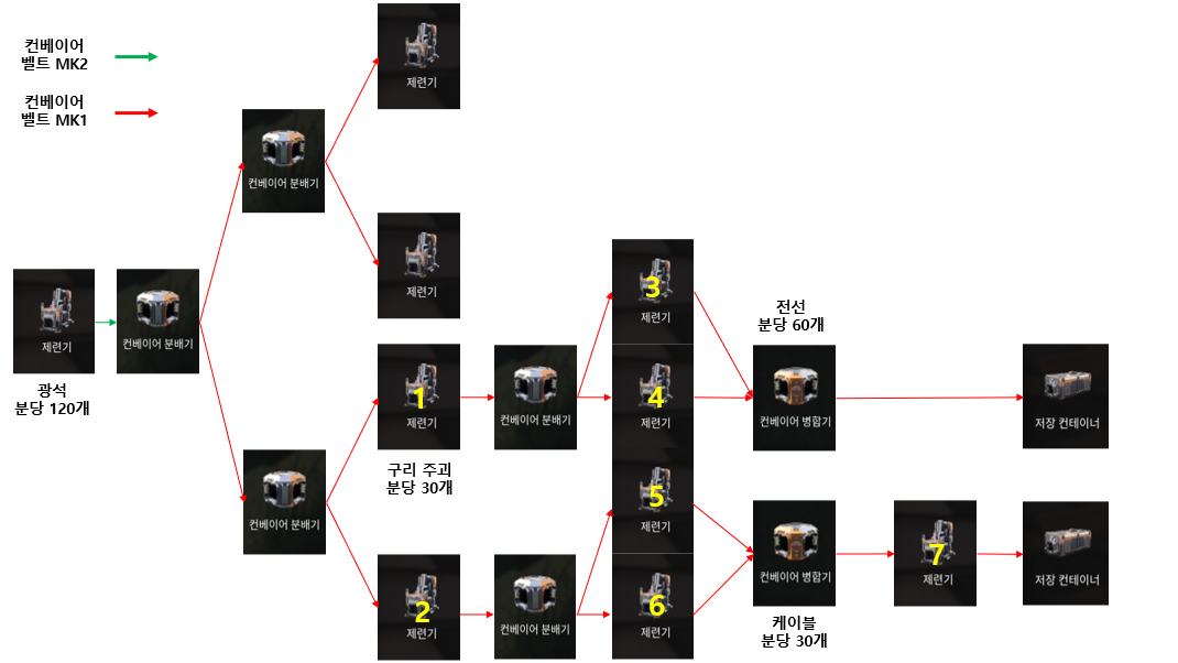 * 채굴기 Mk2, 컨베이어 벨트 Mk2 해금 후 다시 제작한 방식입니다.