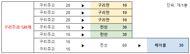 구리주괴에서 뽑을 수 있는 최적을 구해본 것은 아니고 그냥 숫자가 비슷하면 좋을 것 같아서 대충 맞춰보았다. 구리판과 케이블은 1분당 각 30개씩 수급이 가능하고 전선의 경우에는 60개를 얻을 수 있는 수준이다. 사실 개수가 그렇게 많지는 않아보일 수 있지만 자동으로 이정도만 맞춰놓으면 아주 펑펑 써도 남을만큼 쌓이게 된다.