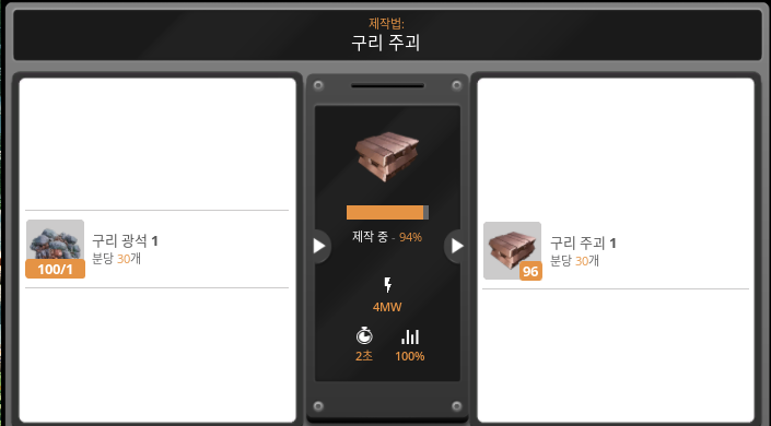 가장 먼저 자동화를 진행했던 광물이 바로 '구리 주괴'이다. 구리 광석을 제련기로 제작하고 구리주괴로 만드는데 구리주괴로 만들 수 있는 품목들이 단순화되어있어서 생각보다 구성하기가 어렵지는 않았다. 순도 보통 기준으로 채굴기 2레벨로 채굴하개되면 구리 광석은 분당 120개를 채굴할 수 있다.