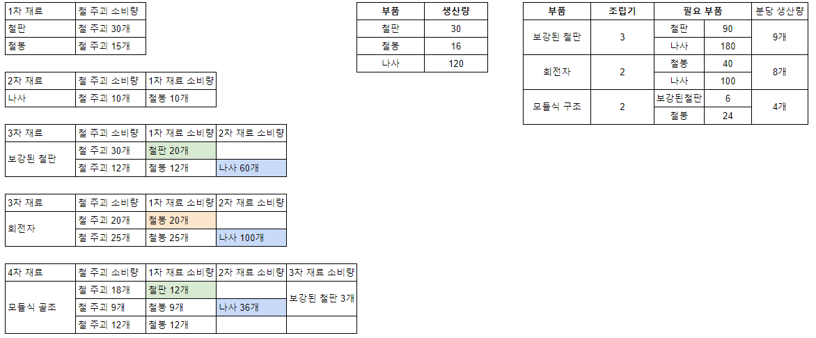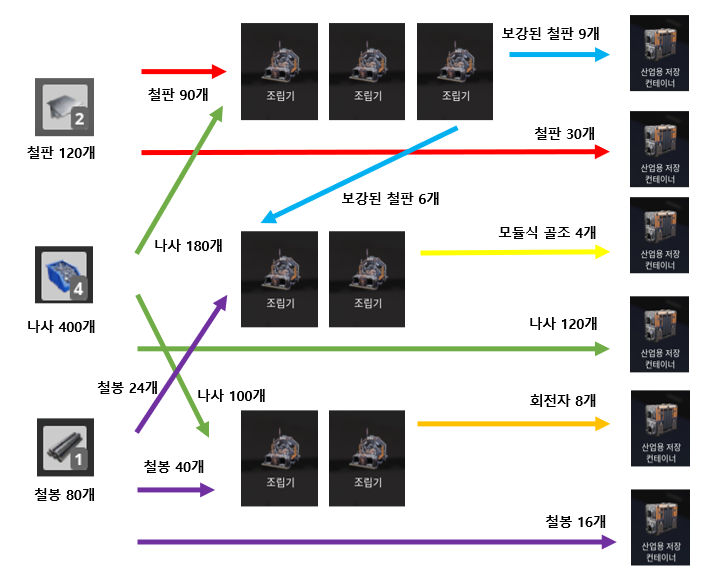 디씨에서 고수분들이 말씀하시길 최적화 할 필요 없이 대충 하라는 말씀이 어떤 것인지 감이 온다. 계산을 하다보니까 딱 떨어지는 것도 좋지만 대부분은 녹록치가 않다. 철판과 철봉 1차재료, 철봉으로 만드는 나사는 제작기에서 제작을 하며 보강된 철판과 회전자, 그리고 모듈식 골조는 조립기로 2개의 부품을 섞어야 한다. 대충 계산을 해봤는데 그냥 어림잡아 해야한 것 같다. 도저히 맞출 수 없다.