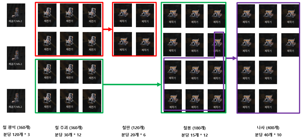 사용 도구: 채굴기 3개, 제련기 12대, 제작기 28대, 조립기 7대