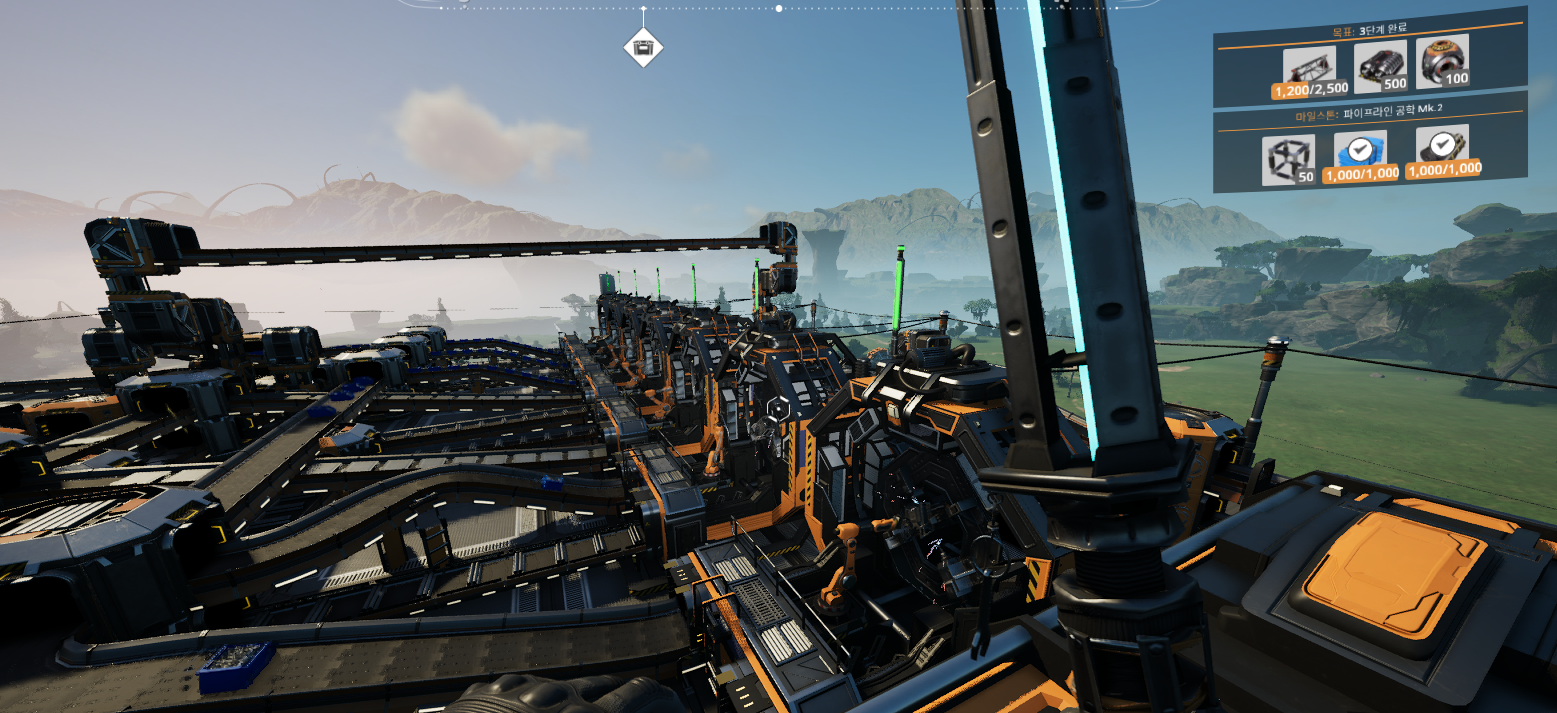 토대를 미리 알았다면 게임을 더 편하게 했을 것 같다. 울퉁불퉁한 평지는 진짜 화나날 정도로 건물 짓기가 어렵다. 건물 짓는거야 어렵진 않지만 오와 열을 맞춰야한다는 생각에 토대를 기반으로 지반을 닦아두었다. 컨베이어 벨트는 생각보다 각도 맞추기가 쉬워서 아래 그림처럼 공장부지 토대까지 컨베이어 벨트로 옮겨주고 있다.