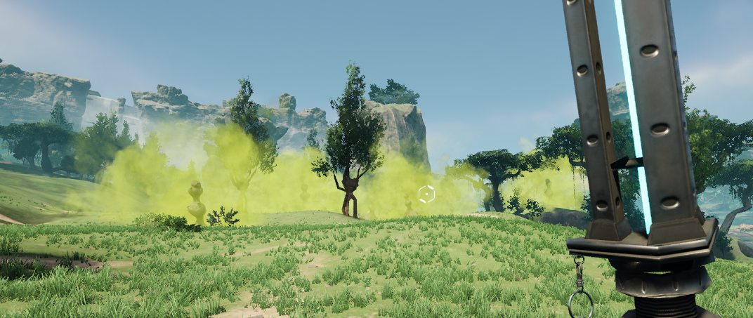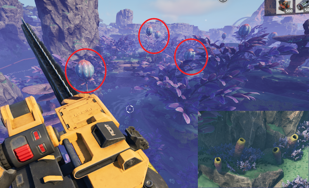 여튼 그 많은 균사는 어디서 얻어야 할까. 이끼가 낀 나무 같은 것을 베면 나오기는 하지만 얻는 균사수가 미비하다. 전 맵을 다 돌아다니지는 못했지만 제일 많이 주는 식물은 아래 그림처럼 엄청 큰 열매가 달린 것 같은 나무이다. 나무 아래에 보면 뭐랄까 맛조개 같은 친구들도 보이는데 이 친구들도 균사를 꽤 많이 준다. 그렇게 해서 한 500개 균사를 얻어왔다. 이제 슬슬 컨텐츠를 진행해보자.