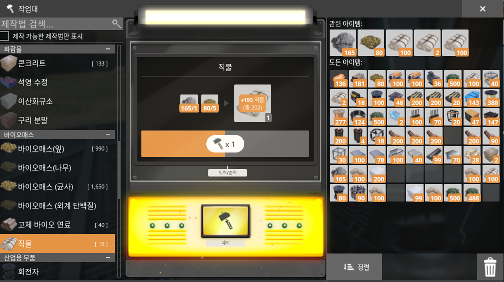 버그라고 하던데, 제작 시 스페이스바를 빠르게 한 번 눌렀다 떼면 자동으로 제작이 된다. 버그라는데 그냥 잘 쓰고 있다. 이렇게 직물을 주구장창 만들어놓으면 게임 할 동안 쓸 직물은 다 만들 수 있지 않을까?