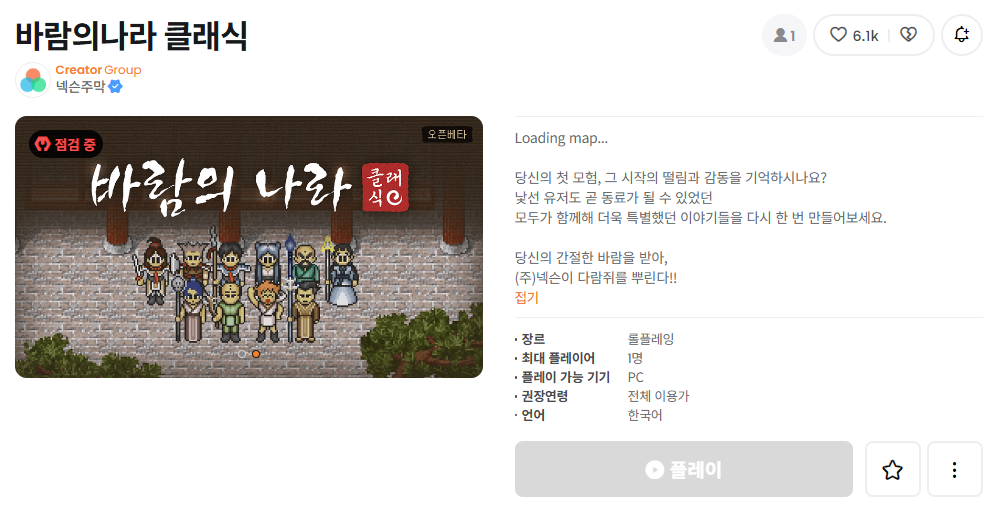 그 시절 바람의나라는 언제나 추억으로 미화되어 나에게 간직이 되어있다. 그러던 중 클래식 바람의 나라를 오픈한다는 소문을 들었다. 메이플스토리 월드에 넥슨이 공식적으로 서비스를 개시한다고 한다. 물론 다른 크리에이터분들이 준비하고는 있었지만 공식적으로 넥슨이 오픈한다고 기사가 났다. 준비하던 크리에이터분들에게는 죄송하지만 누구든 빨리 오픈하는 것을 기다리고 있다.