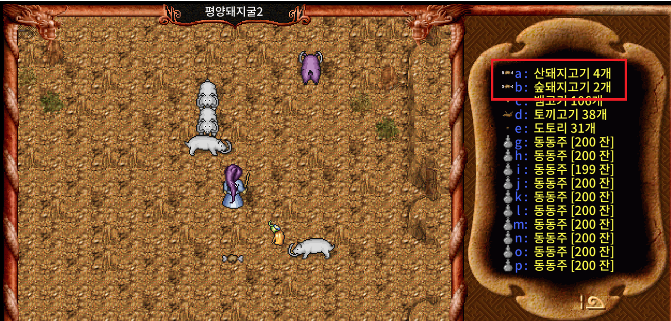 보라색 돼지 (숲돼지는) 그냥 4방컷이 나오니 신경쓰지 말고 때려주면 된다. 34 공력증강을 배우기 전까지는 그냥 돼지고기를 모으는 재미로 사냥을 했다 3~4시간 노가다하면 충분히 34까지 레벨업이 가능하다. 공력증강을 배웠다면 상급 던전보다는 그냥 돼지굴에서 계속 노는 것을 추천한다. 경험치가 거의 비슷비슷하기에 차라리 돈을 더 벌 수 있는 돼지굴이 훨씬 더 좋은 사냥터다.