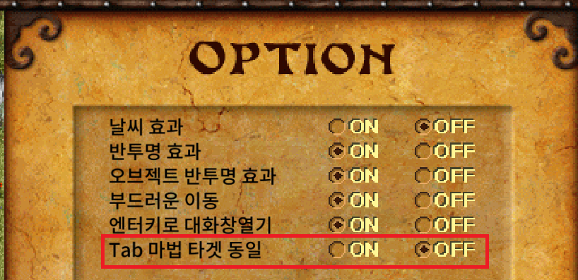 - 1단계: F10을 눌러 옵션에서 Tab 마법 타겟 동일 OFF