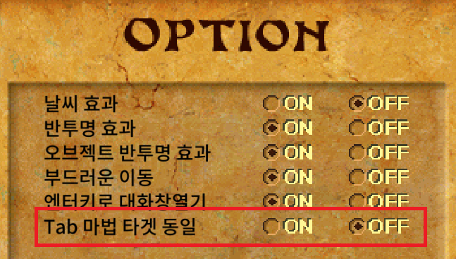 처음에 탭키를 사용하면 자꾸 타겟이 동일하게 움직이는 현상 때문에 이게 왜 좋은지 알 수가 없기 마련이다. 기본 디폴트 값이 마법 타겟을 동일하게 만들기 때문에 그렇다. 이걸 Off로 변경을 해주면 이제 주술사도 편하게 사냥이 가능하다.
