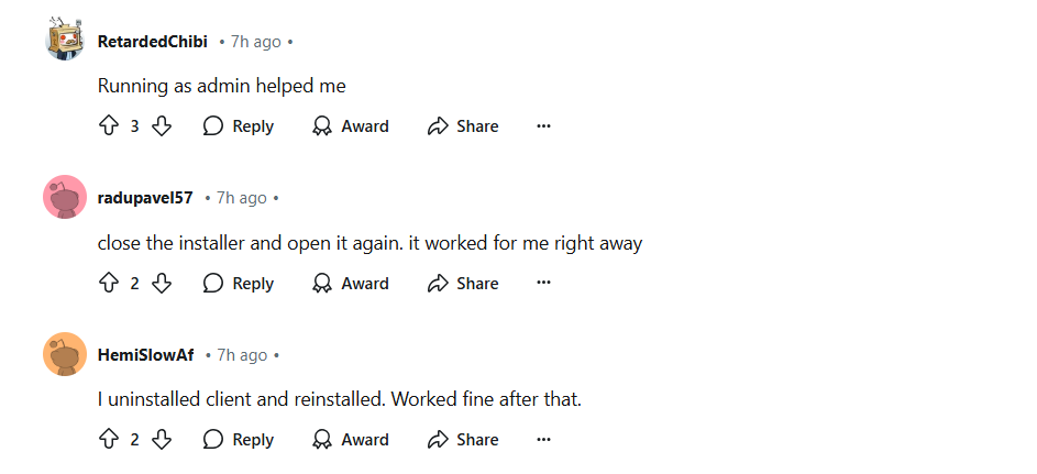 레딧 기준으로 총 4개의 설치 방법을 제시하고 있다. 참고로 한국 카카오게임즈에만 일어나는 현상이 아니고 전세계 적으로 일어나는 에러로 패치가 될 수도 있고 아닐수도 있겠지만 여튼 제시한 방법대로 진행을 해보려고 한다. 집 PC는 설치가 되고 노트북에서만 에러가 나오니 도통 원인을 알 수가 없다.
