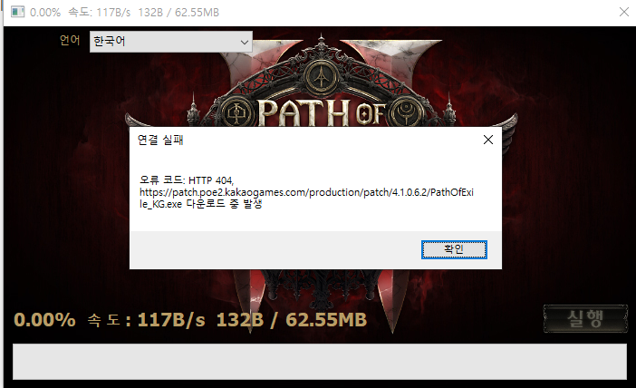 | 연결 실패 오류코드: HTTP 404, https://patch.poe2.kakaogames.com/production/patch/4.1.0.6.2/PathOfExile_KG.exe 다운로드 중 발생 |