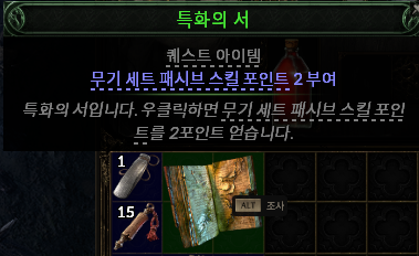 퀘스트 완료 시 '특화의 서'를 준다. 특화의 서는 패시브 포인트 2개를 주는 아주 꿀 퀘스트이므로 꼭 진행하는것이 좋다. 지금이야 당연히 다 퀘스트를 클리어하겠지만 부케릭 키울땐 주요 퀘스트만 하기 때문에 이런 포인트는 꼭 챙겨둬야한다.