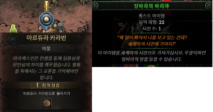배반자 발바라를 잡으면 '발바라의 바리야'라는 퀘스트 아이템을 주면서 새로운 퀘스트 하나가 등장한다. 아르듀라 카라반에 있는 자르카와 대화를 하면 이제 진정한 전직을 할 수 있는 자격을 받을 수 있다. 자르카와 대화를 하면 이제 사막 지도를 통해 세케마의 시련 맵이 오픈된다. 세케미의 시련, 이제 POE2 1차 전직을 할 수 있는 곳이다.