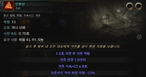 고통의 공물이 버프라면 인화성은 저주이다. 화염으로 치감은 위치 인퍼널리스트에게 화염 저항 깎는 저주는 굉장히 필요한 스킬이지 않을까? 근데 지옥개의 노출을 통해서 화염 저항을 20% 깎는데 또 필요할까 싶지만 생각보다 조금 큰 영향을 주고 있다. 지옥개의 경우에는 그냥 딸깍 용도로 일반 몬스터에게도 적용을 시킬 용도라면 인화성은 보스나 네임드와 싸울때 쓰는 용도이다.