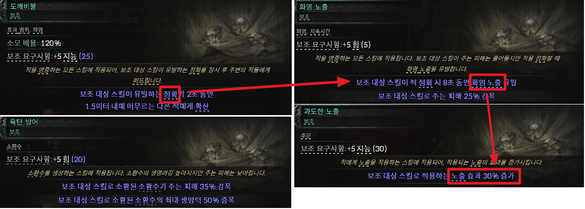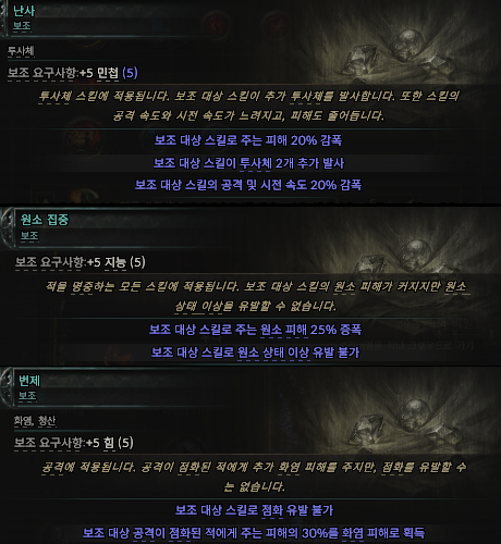 [추천] 화염 피해 추가 (1레벨 보조젬) - 공격 피해 일부를 화염으로 획득, 냉기 번개 피해 감폭. 어차피 불만 쓰는 친구이니 화염 피해만 늘어난다고 보면 된다. 또한 모든 딜이 화염 피해와 화염 저항 깎는 방식이라 화염 피해로 바꾸면 더할 나위 없다.