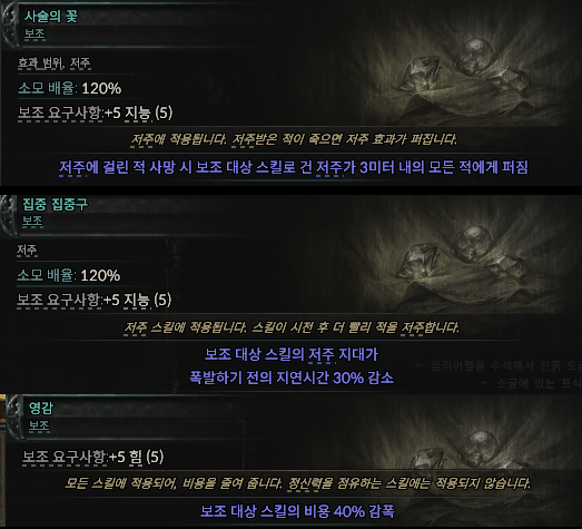 [추천] 집중 집중구 (2레벨 보조젬) - 이름이 어떻게 집중 집중구인가. 곧 패치할 것 같은데. 여튼 시전 후 딜레이가 있는 저주의 시간을 30% 감소해준다. 그러면 조금 더 빠르게 저주를 사용할 수 있다. 분초를 다투는 전투를 하는게 아니기에 의미가 있을까 싶지만 고수들은 이런 차이도 캐치해내는 듯 하다.