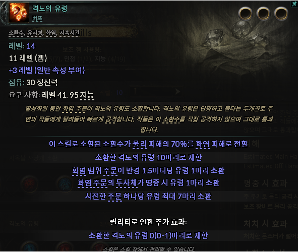 물론 화염벽으로 인한 딜링도 기대하겠지만 주력은 격노의 유령이라는 점을 감안하면 무조건 스킬 캐스팅이 빨라야한다는 것이다. 저항을 깎거나 딜을 넣는 것은 다른 스킬들도 많으니 일단 화염 벽 = 격노의 유령 소환하는 스킬이라는 공식만이 있다. 패치 전에는 더 사기였다는데, 사용해보지 못해서 패치 후에도 체감상 똑같다. 어쩐지 나만 늦더라 싶었다.
