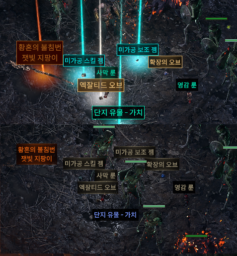 하지만 어느 필터를 착용하던지간에 일단 주요 아이템들은 색깔부터 다르다고 할 수 있다. 물론 필터 개발자의 주관적인 중요도가 포함되기는 하지만 그래도 우리보다 훨씬 더 오랜 시간 필터를 만들고 요구사항을 들었던 분들이기 때문에 믿고 써도 무방하다. 아니, 오히려 나보다 더 믿어야한다.