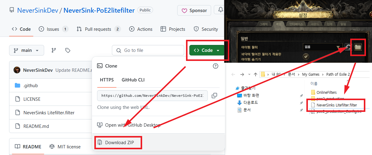 네버싱크 깃허브에서 Code를 클릭하면 Download Zip을 확인할 수 있다. 다운로드 한 알집 파일을 풀면 'filter' 파일이 공통적으로 다 들어가있다. 네버싱크 기준으로 하면 'NeverSinks Litefilter.filter' 파일을 '문서 - My games - Path of Exlie 2' 붙여넣으면 된다.