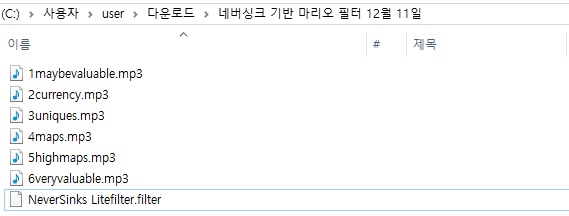 네버싱크는 filter 파일 하나만 있다면 공식 카페에 올라온 것들은 음원 파일까지 같이 올려주신다. 이름에서 알 수 있 듯 값어치 있는 템이나 재화, 유니크, 맵 등과 같이 소리를 따로 구별을 지었는데, 그 소리가 필터 컨셉에 맞가 달라진다. 마리오 필터도 인기가 좋고 뉴진스, QWER 필터도 인기가 많다. 하나씩 들어보고 마음에 드는 것을 선택하는 재미도 있다.