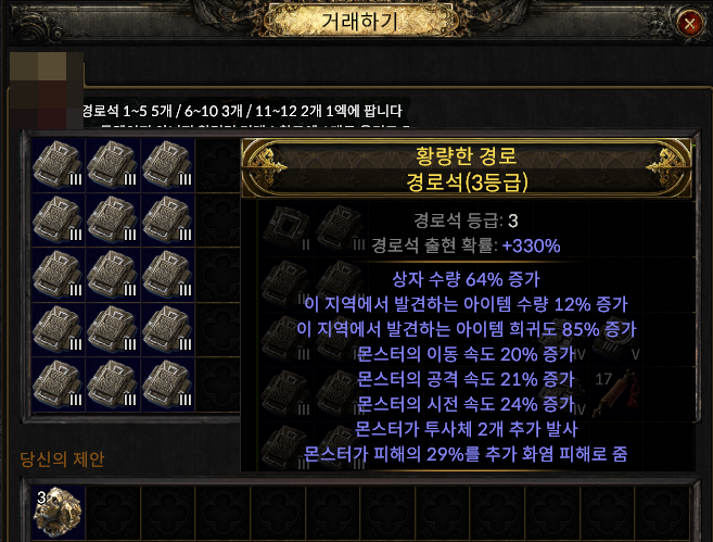 이전부터 TFT (The Fordidden Trove) 서버는 유명했는데, POE2에서도 활발하게 이루어지고 있다. 예를 들어 내가 3티어 짜리 경로석을 사고 싶다면 얼마에 살 수 있는지 아래 링크를 통해서 알 수 있다. 외국형들이 좀 더 싸게 팔면 귓속말 하면 되니 얼마나 편한가.