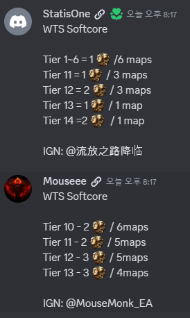 TFT 디스코드 - POE2 Trade - Bulk Waysotnes - WTS 에서 경로석을 구할 수 있다. 새벽까지만 하더라도 1~6티어 짜리 경로석이 4개에 1엑잘 했는데 지금은 6개에 1엑잘에 거래가 되고 있다. 뭐, 시세는 항상 변하니까. 이제 시간이 지나니 저티어 맵은 이제 팔지도 않는다.