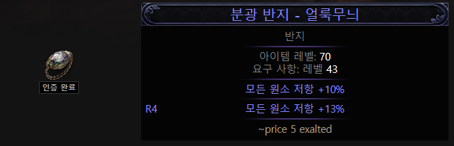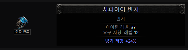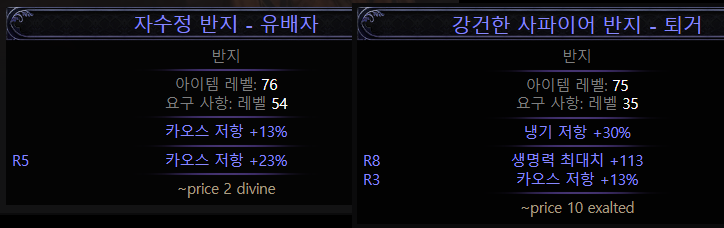 - 추천 반지 베이스: 사파이어 반지 (기회의 오브), 저항 반지, 균열반지 등