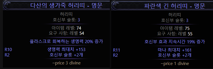 가격을 보더라도 플라스크 회복량 20% 즉시 회복을 추천할 뿐이지 가격차이가 많이 나지 않는다. 허리띠는 그냥 호신부 슬롯 2개가 붙으면 어떤 고정 옵션이어도 가격이 책정이 된다는 결론이다.